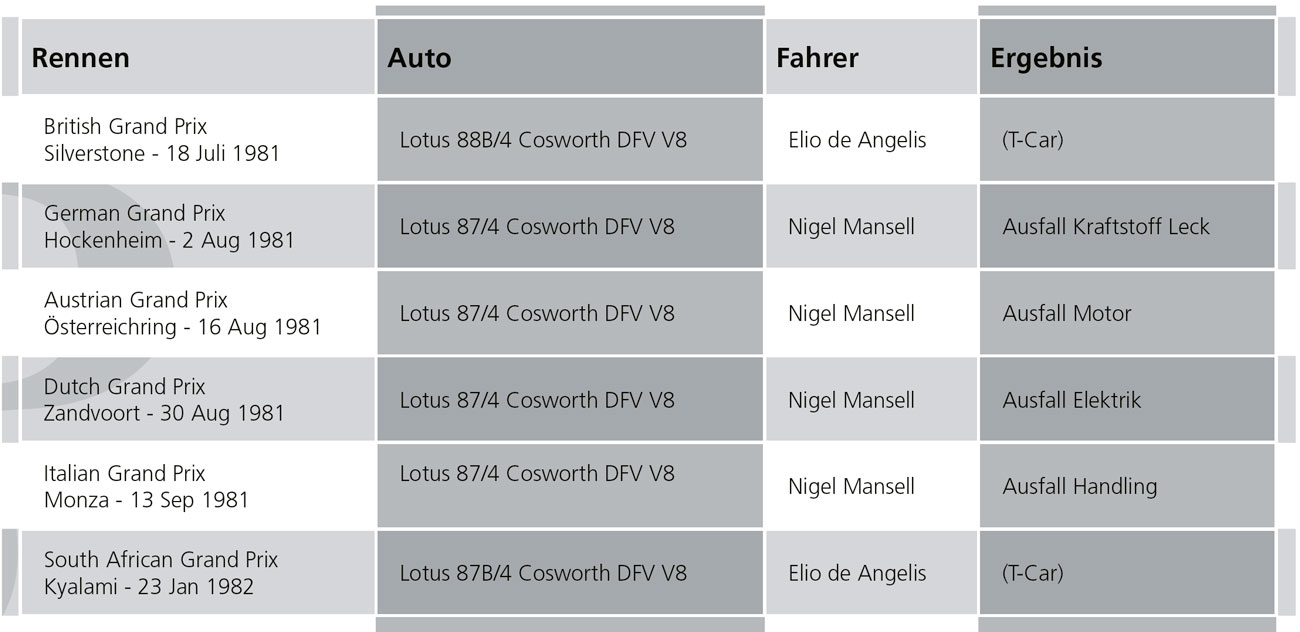 Nach dem GP von Italien bekam Mansell Chassis Nummer 5, und 87/4 diente ab da als sogenanntes „T-Car“. Dabei sah der erste Auftritt eines Lotus 87 in Monaco vielversprechend aus. Mansell auf Startplatz drei und de Angelis Sechster! Doch beide sahen die Zielflagge nicht. Ein Podestplatz war dem 87er gegen die teilweise Turbobefeuerte Konkurrenz von Ferrari und Renault verwehrt. Vierte Plätze waren das Maximum für das sonst vom Erfolg verwöhnte Lotus-Team. Für die Saison 1982 wurde aus dem 87/4 der 87B/4. Dieser Unterschied bestand haupt-sächlich durch einen längeren Radstand mittels eines Distanzadapters zwischen Motor und Getriebe, was maßgeblich die Gewichtsverteilung verbessern sollte, sowie breiteren Seitenkästen mit den integrierten Flügelprofilen. Der 87B war um 27 Kilo leichter. Mit dem 87er experimentierte Lotus übrigens mit dem „aktiven Fahrwerk“. Doch diese Version reifte auch nicht zum Erfolgsschlager und wurde rasch wieder „ad acta“ gelegt.