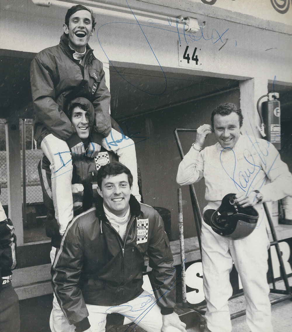 Rennpause bei meiner Tante Maria im Hof neben der Ruine von Schloss Schönberg von Oberwesel, Blödelei und Scheibenschießen mit einer Beretta, bei dem die damals 70-jährige Dame mit ihrer Waffe – zur Verteidigung gegen Eindringlinge normalerweise unter ihrem Kopfkissen aufbewahrt – stets als Beste abschnitt. Ziemlich zielgenau und oft in der Zehn! Hatte sie doch einmal während ihres Frühstücks im Bett ein vorwitziges Eichhörnchen vom Fußende ihrer Lagerstatt geschossen. Natürlich durfte ein guter Tropfen Rhein-wein auf diesem abgeschiedenen aber umso romantischeren Fleckchen Erde nicht fehlen. Dem gelegentlichen Ritual bei den „aunties“ (Tantchen) fröhnten vor einem 1000-Km-Rennen auf dem Nürburgring die Herren Redman, Hobbs und Hawkins gern – wie einmal auch dem „ritterlichen“ Miteinander auf der Burg Thurant an der Mosel. Dazu wurde der edle Saft der Wein-gärten auf der Sonnenseite des Gemäuers genossen. Als sich hier Brian Redman einen Vollvisier-Helm – wohlgemerkt aus dem 16. Jahrhundert – überstülpte und damit Passgenauigkeits-Probleme bekam, konnten sich seine Frau Marion sowie die Mitstreiter Richard Atwood, David Hobbs und Mike Hailwood ein Grinsen nicht verkneifen. Derartige Anlässe auch zusammen mit dem unvergessenen Vic Elford – sowie Jahre später mit Vern Schuppan und Mario Andretti auf der Schönburg – dienten nicht zuletzt der Kommunikation. Man ließ Motorsport und Privates Revue passieren und vertiefte freundschaftliche Bande. Als ich im September 1972 für „rallye racing“ ein Redman-Portrait schreiben sollte, konnte ich natürlich aus dem Vollen schöpfen.
