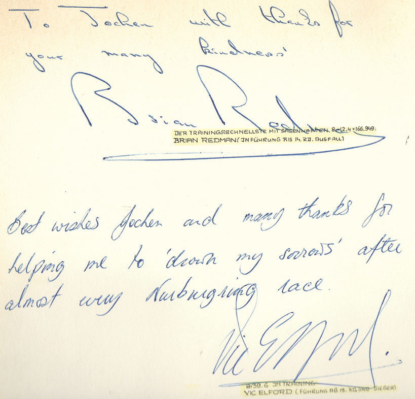 Zwischen 1967 – man hatte sich anlässlich des 1000-Km-Rennens von Spa kennen gelernt – und 1972 hatten Brian Redman und Jochen von Osterroth auch privat häufig Kontakt. Der Brite, mit insgesamt 54 Gesamtsiegen bei Sportwagen-Rennen und einem Podestplatz gleich bei seinem zweiten F1-Einsatz erfolgreich, lebt heute in Florida und ist auch im hohen Alter noch äußerst aktiv. Am 9. März feierte er seinen 87. Geburtstag.