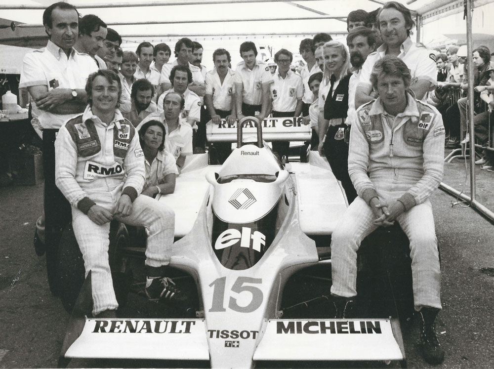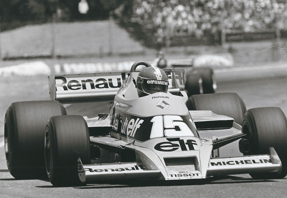 Der in Bezug auf die Technik seines Rennwagens äußerst versierte Jean-Pierre Jabouille fuhr 1979 – nach einem weiteren Motorendefekt in Buenos Aires – in Interla-gos nur auf Ankommen, während Schwa-ger Laffi te einen weiteren Start-Ziel-Sieg im Ligier JS11 feiern konnte. In Kyalami stellte er den R.S. 02 auf die Pole-Position, leider brach in der 48. Runde eine Ventilfeder. Beim Training in Long Beach scherte eine Halbwelle ab: Jabouilles Renault spielte anschließend mit 270 km/h Pingpong mit den Begrenzungsmauern. Jean-Pierre kam mit blauen Flecken davon. Da aber auch bei seinem neuen Teamgefährten René Arnoux die Halbwellen versagten, verzich-tete Renault aus Sicherheitsgründen auf einen Start. Nach drei Null-Nummern folg-te der Grand Prix von Frankreich in Dijon – der Durchbruch! Ein Paukenschlag be-reits in der Qualifi kation, denn Jean-Pierre Jabouille und René Arnoux verwiesen die Herren Villeneuve, Piquet, Scheckter und Lauda klar auf die Plätze. Während sich Gilles Villeneuve und René Arnoux – Ab-stand meist innerhalb einer Sekunde – ein heftiges Duell um den zweiten Platz lie-ferten, zog Jean-Pierre locker davon. Freudentränen in der Équipe Renault: erster Turbo-Sieg in der Formel 1! Während Jean-Pierre in Silverstone wieder einmal von einer gebrochen Ventilfeder „geprügelt“ wurde, rettete sich René Arnoux mit nachlassenden Bremsen als Zweiter hinter Clay Regazzoni über die Ziellinie. Jabouilles Pole-Position in Hockenheim „erstickte“ nach einem Dreher im badischen Sand neben der Pis-te. Einziges erquickendes Erlebnis jenes Wochenendes: Die Formel-1-Party im „Dorian Gray“ des Frankfurter Flughafens. Kupplungsschäden in Zeltweg und Zandvoort, in Monza einmal mehr eine gebroche Ventilfeder, Jean-Pierre: „Es ist zum Verzweifeln.“ Bremsdefekt in Montreal, Wasser in der Elektrik beim Regen-rennen von Watkins Glen: Jean-Pierre blieb auf seinen neun Punkten von Dijon sitzen.
