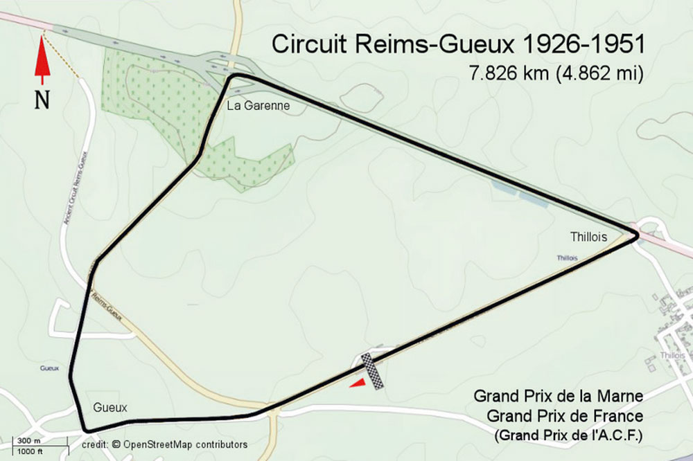 Am 25. Juli 1926 eröffnete dann der Automobile Club Ardenne Champagne Argonne in den Getreidefeldern der Champagne, im Flachland am Fuße der französischen Ardennen, eine rund 7,8 Kilometer lange Rennstrecke einfach durch Absperren eines „Dreiecks“ aus öffentlichen Landstraßen mit ebenso relativ stupidem Strecken-Verlauf – bis auf drei Haarnadel-Kurven ging es wesentlich geradeaus. Aus heutiger Sicht höchst bedenklich, enthielt die erste, bis 1951 gefahrene Strecken-Variante sogar noch die Ortsdurchfahrt Gueux, hier lag das enge Eck zwischen einer Metzgerei und einem Lebensmittelladen… Das Eröffnungsrennen, den „Grand Prix de la Marne“, der bis 1937 dort jährlich in verschiedenen Rennwagen-Kategorien ausgetragen wurde, gewann als Tagessieger Francois Lescot auf einem Bugatti Typ 35. Er absolvierte 40 Runden Renndistanz mit einem Schnitt von 112,768 km/h und drehte die schnellste Rennrunde in 4.03 Minuten (118,518 km/h). Das liest sich heute harmlos, war aber für die unbefestigten Landstraßen seinerzeit und eine praktisch kaum vorhandene Haftung der schmalen Reifen im Grenzbereich schon ein enormes Tempo.