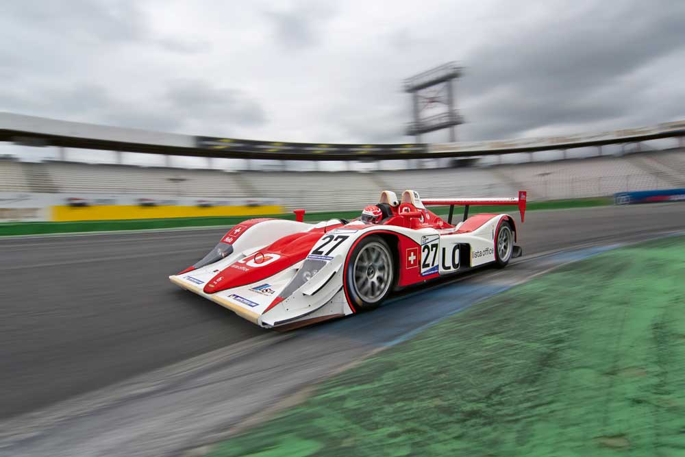Ich folge einer Einladung von Fredy Lienhard nach Hockenheim, um dort sei-nen Lola B05/40 zu fahren, mit dem er von 2005 bis 2007 in der European Le Mans Serie, bei den 12 Stunden von Sebring und der American Le Mans Serie am Start war. Ich fahre in das Hockenheimer Fahrerlager, leider ist der Himmel Wolken verhangen, und es fängt an zu tröpfeln. Bei Rennen fahre ich ja gern im Regen, aber bei einem Trackday würde ich gern bessere Bedingungen haben. Aber man kann es sich nicht immer aussuchen… Fredy Lienhard möchte, dass ich für ihn einen „Roll Out“ fahre, also einen Funktionstest mache, ob alles seine Richtigkeit hat. Ich steige über den Seitenkasten in das Cockpit und lasse mich in den Sitz gleiten. Für einen modernen Sportwagen finde ich eine ungewöhnliche Sitzposition vor. Bei den modernen Sportprototypen hat man eigentlich die Füße recht hoch, da die Front, Formel -ähnlich, eine hohe „Nase“ hat um die Luft unter das Auto zu leiten. Hier muss ich gleich an die Sitzposition der Formel 1-Autos der 70er-Jahre denken. Jim Clark hätte sich hier gleich „zu Hau-se“ gefühlt. Man liegt also mehr. Für mich ungewohnt in einem LMP-Auto. Das ist der Aerodynamik geschuldet. Das ganze Monocoque ist sehr flach gehalten, um einen guten Cw-Wert zu erzielen und das führt zur recht liegenden Sitzposition.