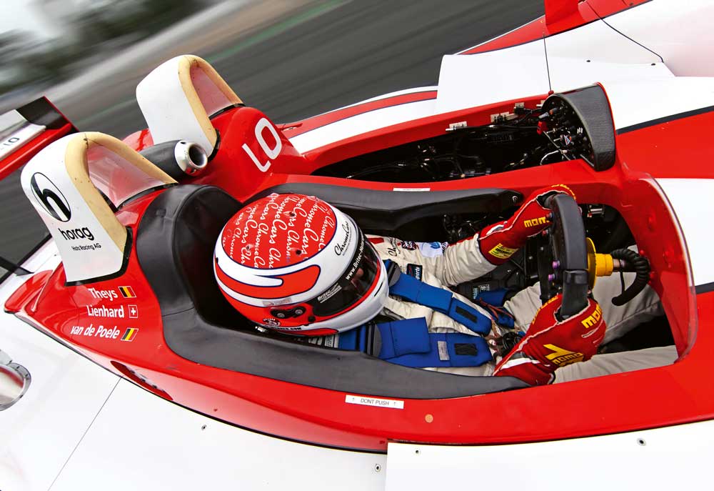 Von Benny Hotz bekomme ich kurz das Cockpit erklärt und dann heißt es, „Start your Engine“. Der Judd V8 fängt schon im Stand an, seine aggressiven Töne von sich zu geben. Dann heißt es, „ersten Gang einlegen“ indem ich an der Lenkradwippe ziehe, und ich darf aus der Box fahren. Die erste Hürde, anfahren ohne den Motor abzuwürgen, meistern wir mit Bravour. Beim 3,4 Liter Motor liegt genug Drehmoment an. Dann geht’s auf die noch nasse Strecke, leichte Tropfen treffen das Helmvisier. Ich steigere langsam die Gangart und finde im nassen ein recht gutmütiges Auto vor. Als ich dem Limit nahe komme, habe ich nur ab und an ein nervöses Heck beim Ein-lenken. Im Kurvenverlauf ist das Fahr-verhalten eher leicht untersteuernd, er schiebt also leicht über die Vorderachse und ist damit gut zu handhaben. Nach ein paar Runden gehe ich wieder an die Box, Mission „Roll Out“ erfüllt, es funktioniert alles tadellos. Auch nach fast 20 Jahren funktioniert – auch aufgrund der Betreuung bei „Horag Racing“ – alles tipptopp. „Horag Racing“ aus der Schweiz hat das Auto schon in den Jahren 2005 bis 2007 bei den Rennen bestens betreut.