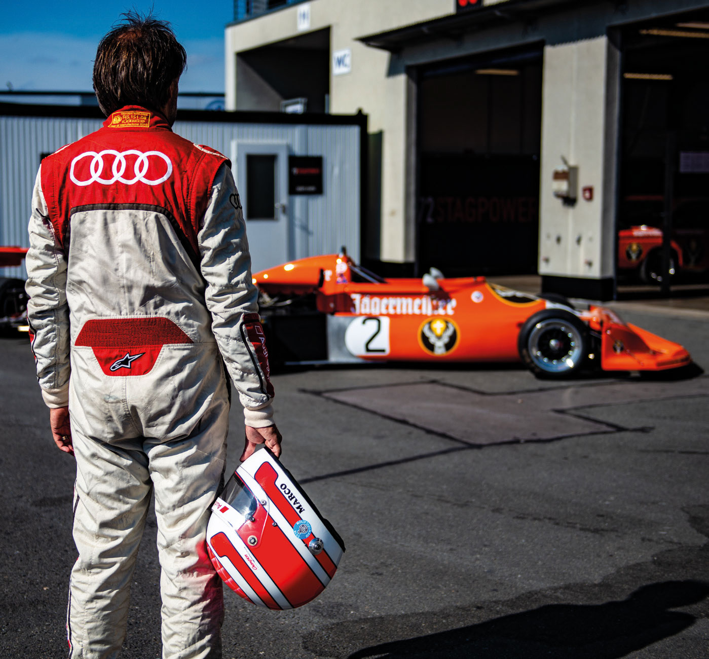Der Jägermeister-March-BMW 772p soll das vierte Auto sein, welches ich an diesem unglaublichen Tag bewegen darf. Freut man sich sonst schon einmal darüber, überhaupt einmal einen Formel 1 fahren zu dürfen, setzen Ecki und Oliver Schimpf an diesem Tag für mich immer wieder einen drauf. Nach dem March-Formel-1 durfte ich den BMW 320 Gruppe 5 und einem 3,0 CSL die Sporen geben. Nun lasse ich mich in den March-Formel 2 von 1977 gleiten. Ich nehme die Beingurte und rutsche tief ins Cockpit. Doch Anschnallen kann ich mich allein nicht in dem engen Cockpit. Timo Rumpf-keil, der gerade aus dem Jägermeister-Gruppe C-Porsche 962 geklettert ist, kommt mir zur Hilfe und schnallt mich an. Vor mir macht es sich „Strietzel“ Stuck in seinem Formel-1-March noch einmal bequem, den ich vorhin schon einmal fahren durfte.